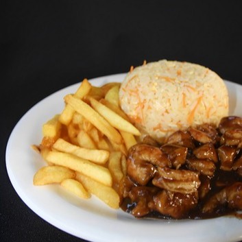 Frango e legumes ao molho da casa, batata frita e arroz branco ou risoto.