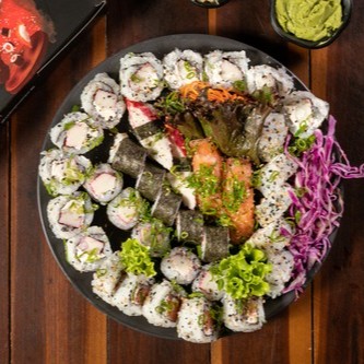 20 cariocas mistos (camarão, skin e kani) + 5 uramamkis de kani + 5 uramakis skin + 5 uramakis de salmão + 5 uramakis de camarão + 6 niguiris (2 salmão, 2 camarão e 2 kani).