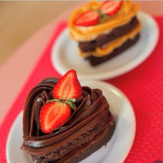 2 Camadas de Brownie Delicioso com Recheio e Cobertura em formato de Coração.