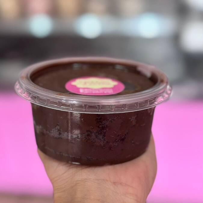 Bolo de chocolate com camadas de recheio de brigadeiro de Ninho. Pote de 200ml de delícia.