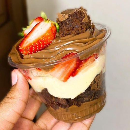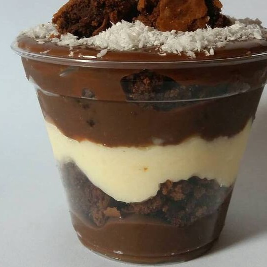 A nossa sobremesa 'Copo da Felicidade Prestígio' é uma deliciosa combinação de sabores. Ela é feita com o nosso irresistível brigadeiro ao leite, rico e cremoso, que se une harmoniosamente aos pedaços suculentos de brownie. Além disso, nossa inovadora criação é acentuada pelo brigadeiro de coco flocado, acrescentando textura e um toque tropical à sobremesa. Finalizamos com mais uma camada de brigadeiro, porque acreditamos que nunca é demais! Cada colherada deste copo da felicidade é uma explosão de sabor para agradar os paladares mais exigentes.