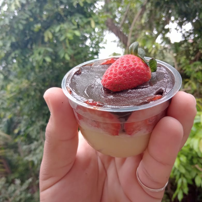 O Copo da Felicidade Desejo flocado é uma combinação divinal que traz o irresistível brigadeiro ao leite, suave e cremoso, casado perfeitamente com o brigadeiro de coco, que traz uma explosão de sabor frutado. Para completar, temos os mini brownies, pequenas delícias de chocolate intensas e macias, que se unem aos morangos, clássico e reconfortante. Esta maravilha culinária, pertencente à categoria 'Copos da Felicidade', é uma verdadeira festa de sabores e texturas na boca, proporcionando um momento de prazer inesquecível.