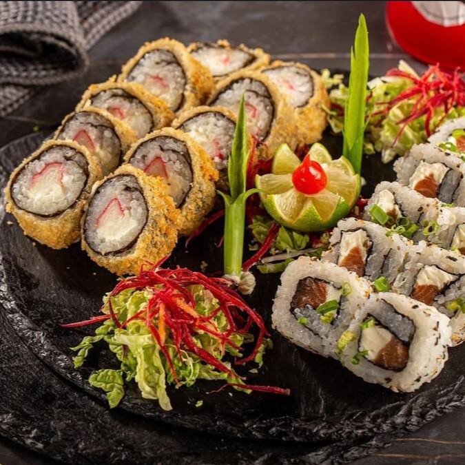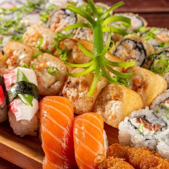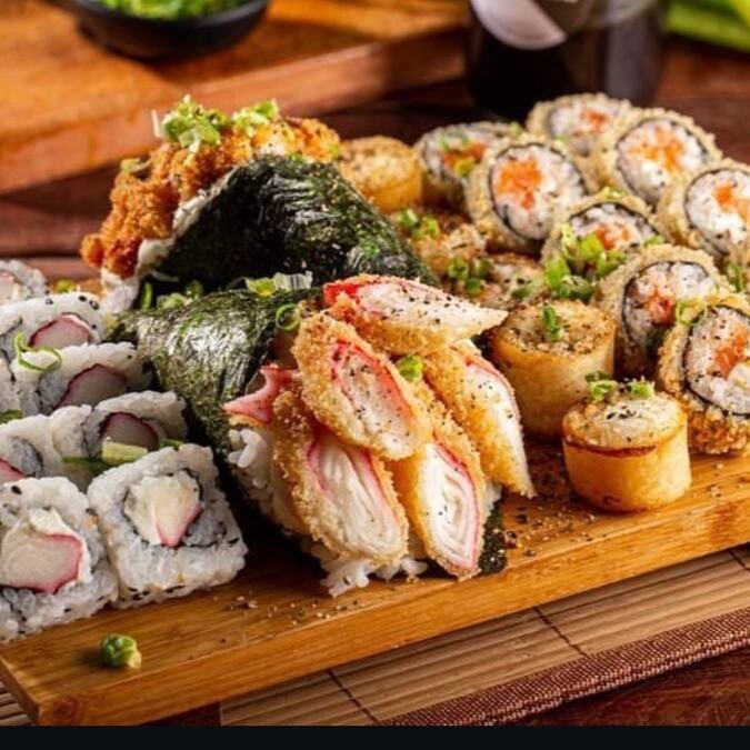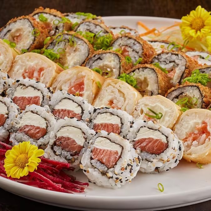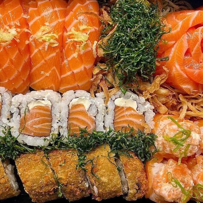 10 Uramaki salmão+ 10uramaki camarão empanado + 10 hot pasta salmão + 10 carioca kani + 3 niguiri kani + 3 niguiri salmão + 4 temopura camarão. já acompanha 2 shouy sache + 2tarê + 2 hashi.