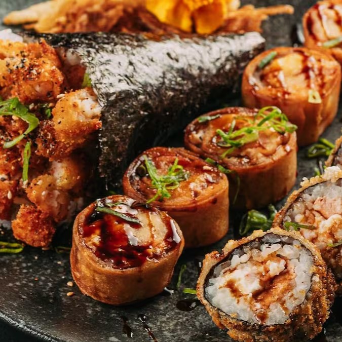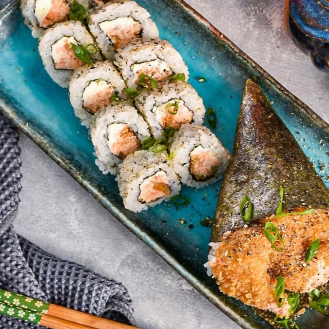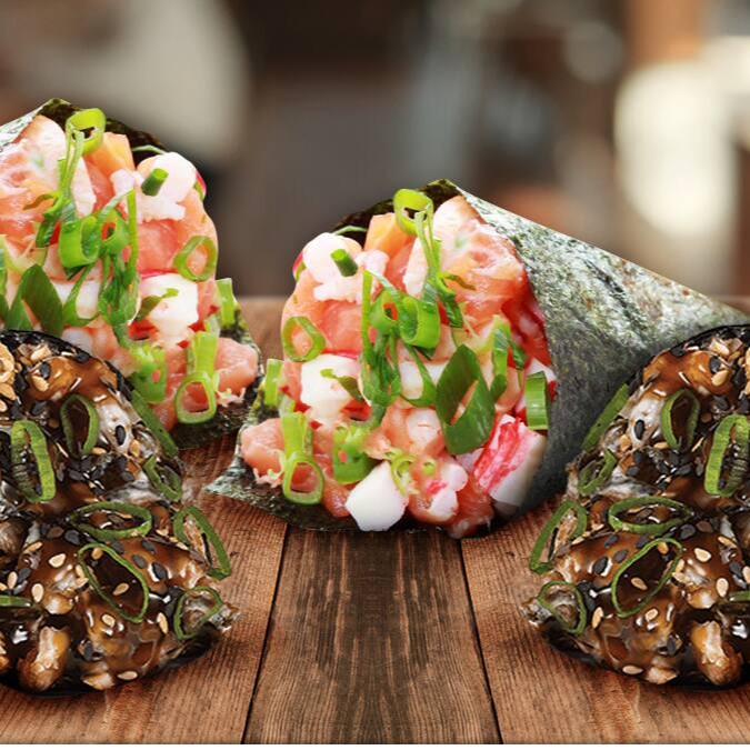 1 delicioso temaki de camarão empanado + 5 peças de hot de salmão +5 peças de carioca de kani. Obs: já acompanha 1 shouy sache + 1 tarê + 1 hashi