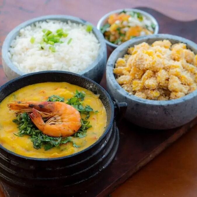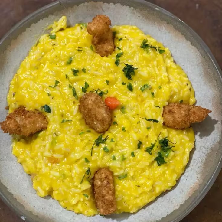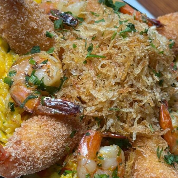 Delicioso arroz com creme de camarão, servido com camarões grandes empanados na farinha especial da casa. Uma experiência gastronômica irresistível.