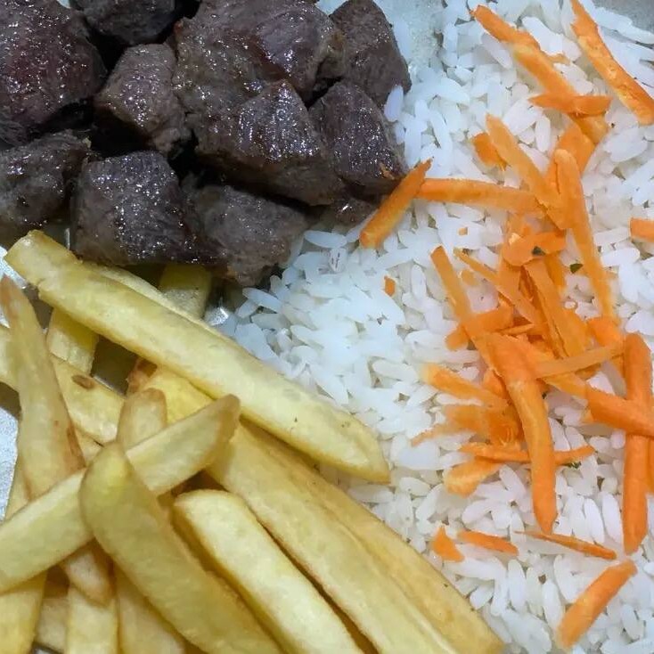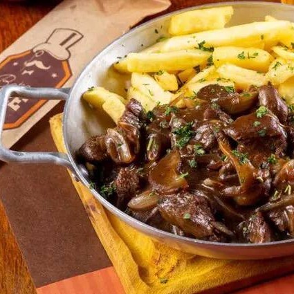 Cubos de filé mignon em molho escuro, acompanhados de batatas finas e crocantes, uma delícia para os amantes de carne.