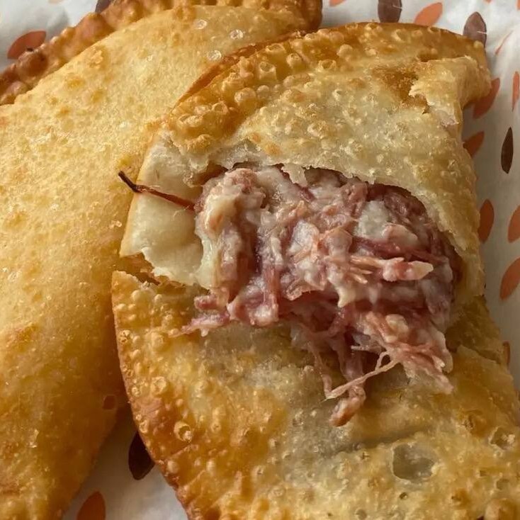 Porções de pastéis de massinha crocante com recheio de charque com creme de queijo, uma combinação perfeita.