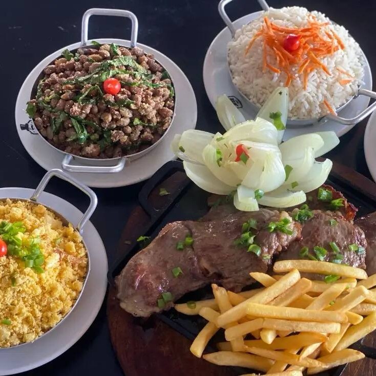 Maminha, farofa de ovos, batata frita, feijão tropeiro, arroz branco e cebola girassol.