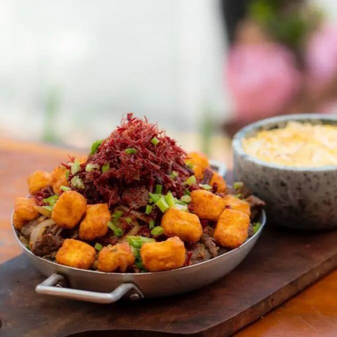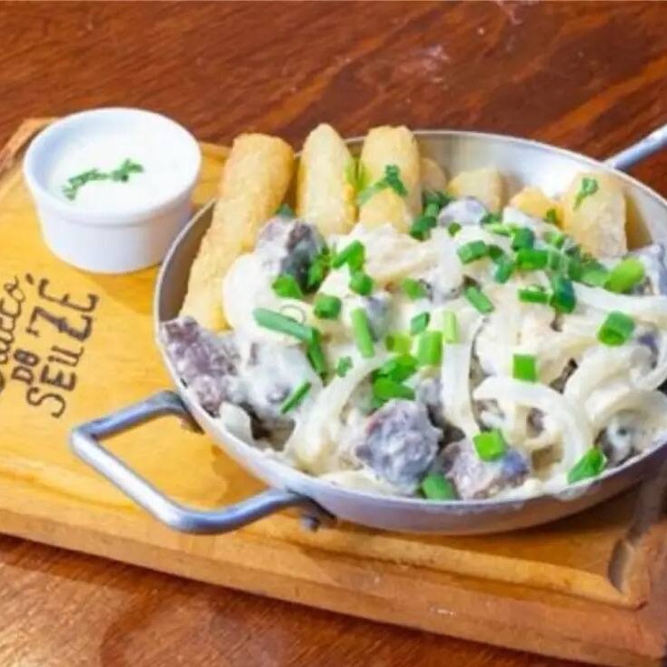 Carne de sol em cubos, melada em uma deliciosa nata de queijo, acompanhada de fritas de macaxeira, um prato típico e saboroso.