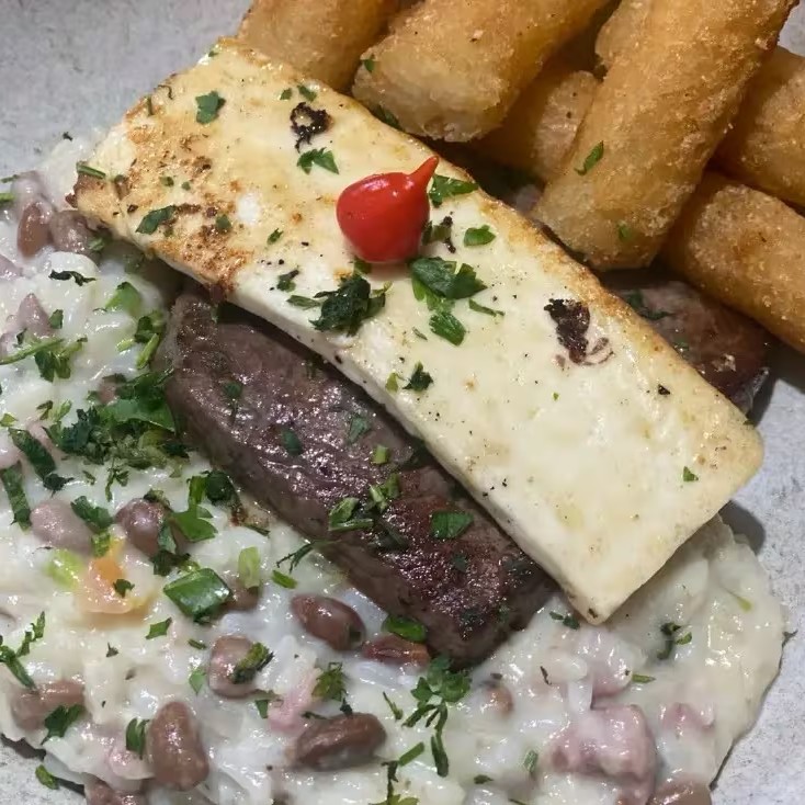 Carne de sol com queijo coalho, baião de dois e 5 unidades de macaxeira frita. Uma delícia nordestina que traz o sabor autêntico do sertão.