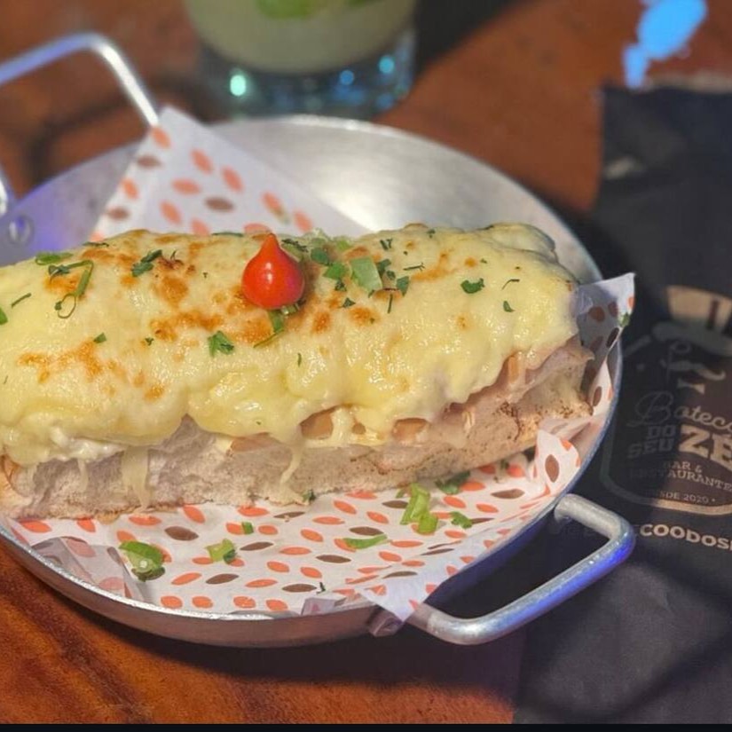 Pão de alho da casa com queijo provolone gratinado, ervas e azeite, uma entrada clássica e deliciosa.