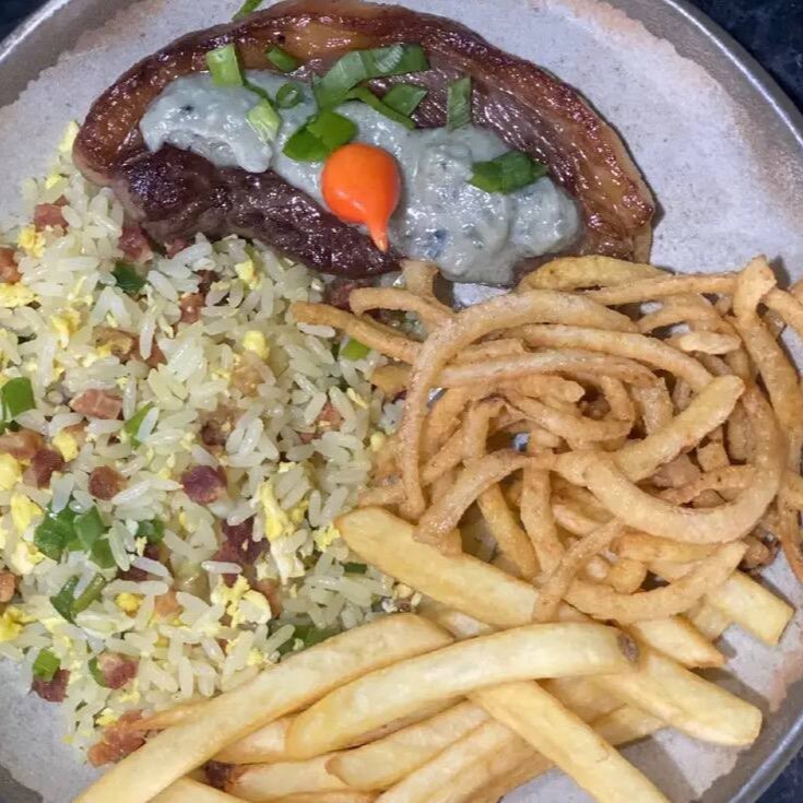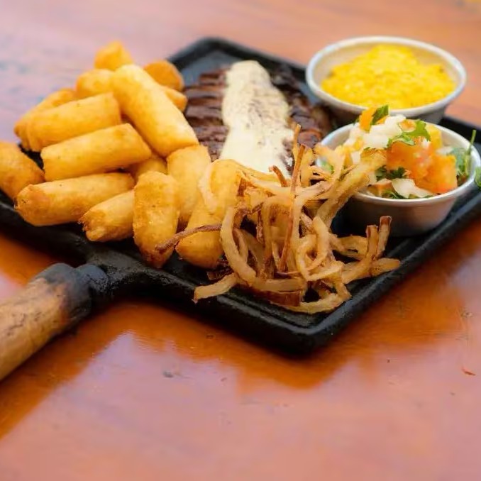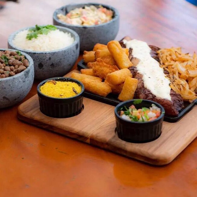 Picanha grelhada e fatiada, coberta com deep de cebola, rolinho de macaxeira frita, farofa e fritas, uma combinação perfeita de sabores.