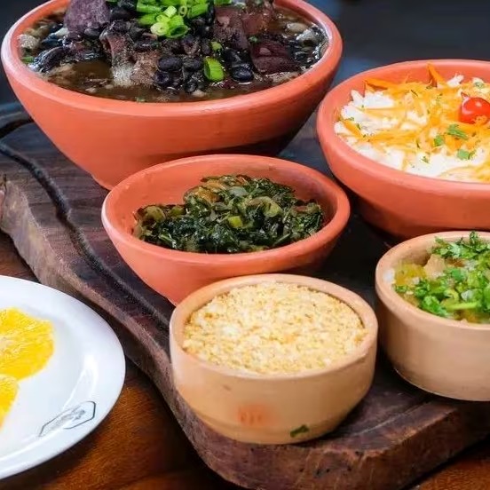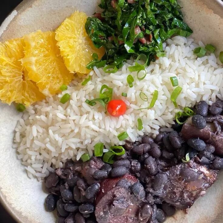 Arroz e couve. A clássica feijoada brasileira, rica em sabores e perfeita para um almoço em família.