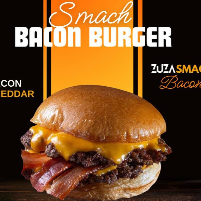 Experimente o incrível Smash bacon Burger, um hambúrguer suculento de 90g com queijo cheddar e maionese da casa em um delicioso pão brioche selado na chapa.