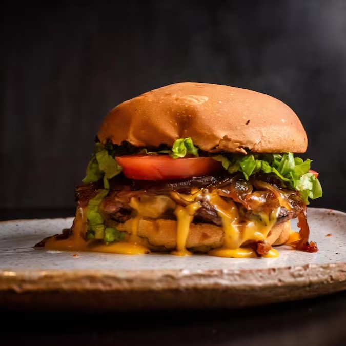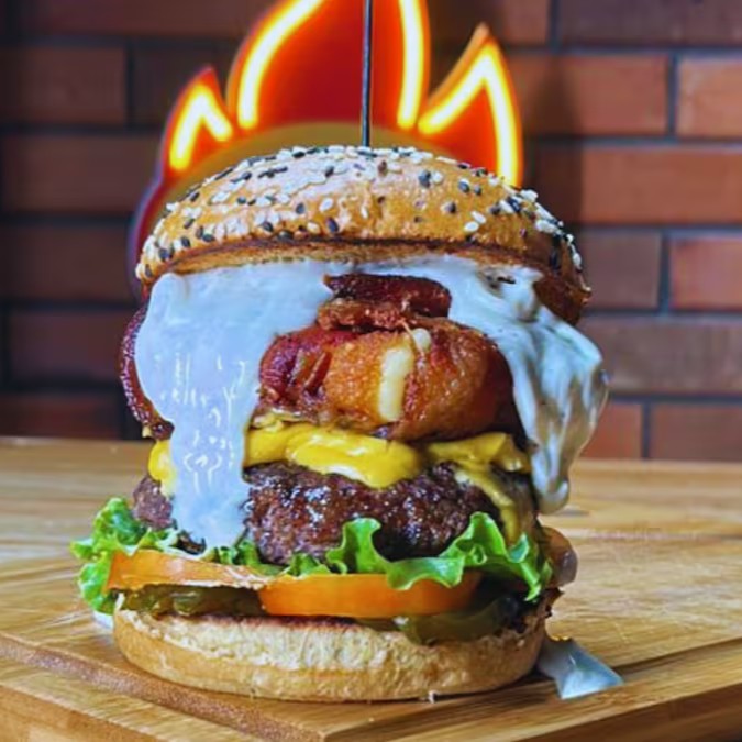 Uma explosão de sabores com pão, blend de carne bovina 90g, queijo cheddar cremoso, farofa de bacon, tomate, alface, cebola caramelizada e maionese da casa.