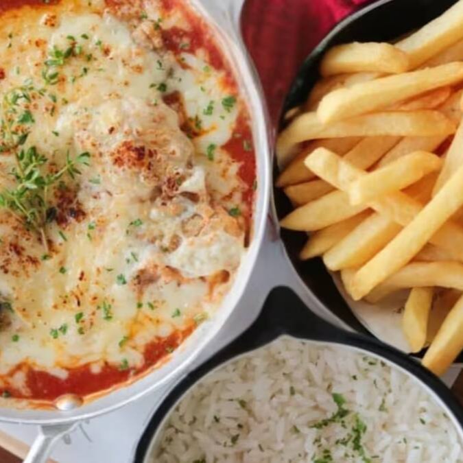 Frango empanado, queijo muçarela gratinado, acompanhado de arroz branco e batata-frita
