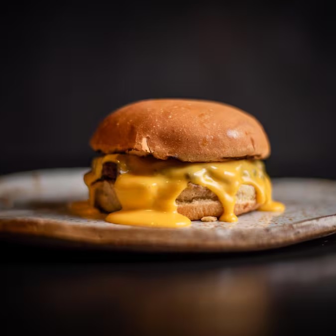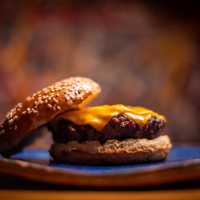 A carne bovina de 70g é prensada na chapa, garantindo bordas crocantes e um interior suculento. Servido em pão fresco, é coberto com cheddar cremoso que derrete sobre a carne, criando uma combinação perfeita de texturas.