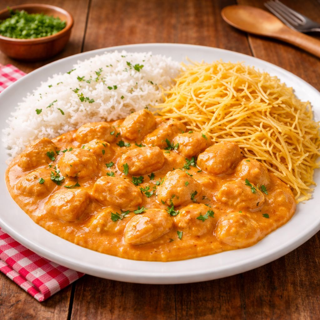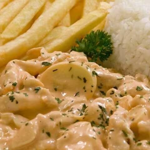 O delicioso filé de frango ao molho estrogonofe acompanhado de arroz branco e batatas fritas