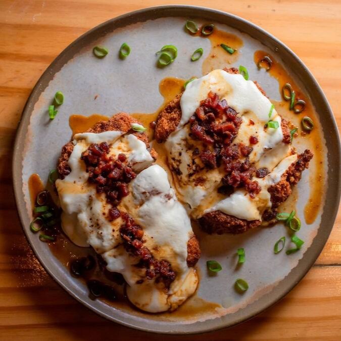 Frango empanado e crocante, coberto com fonduta de queijo e molho caramelo de bacon. Uma delícia irresistível para os amantes de frango.