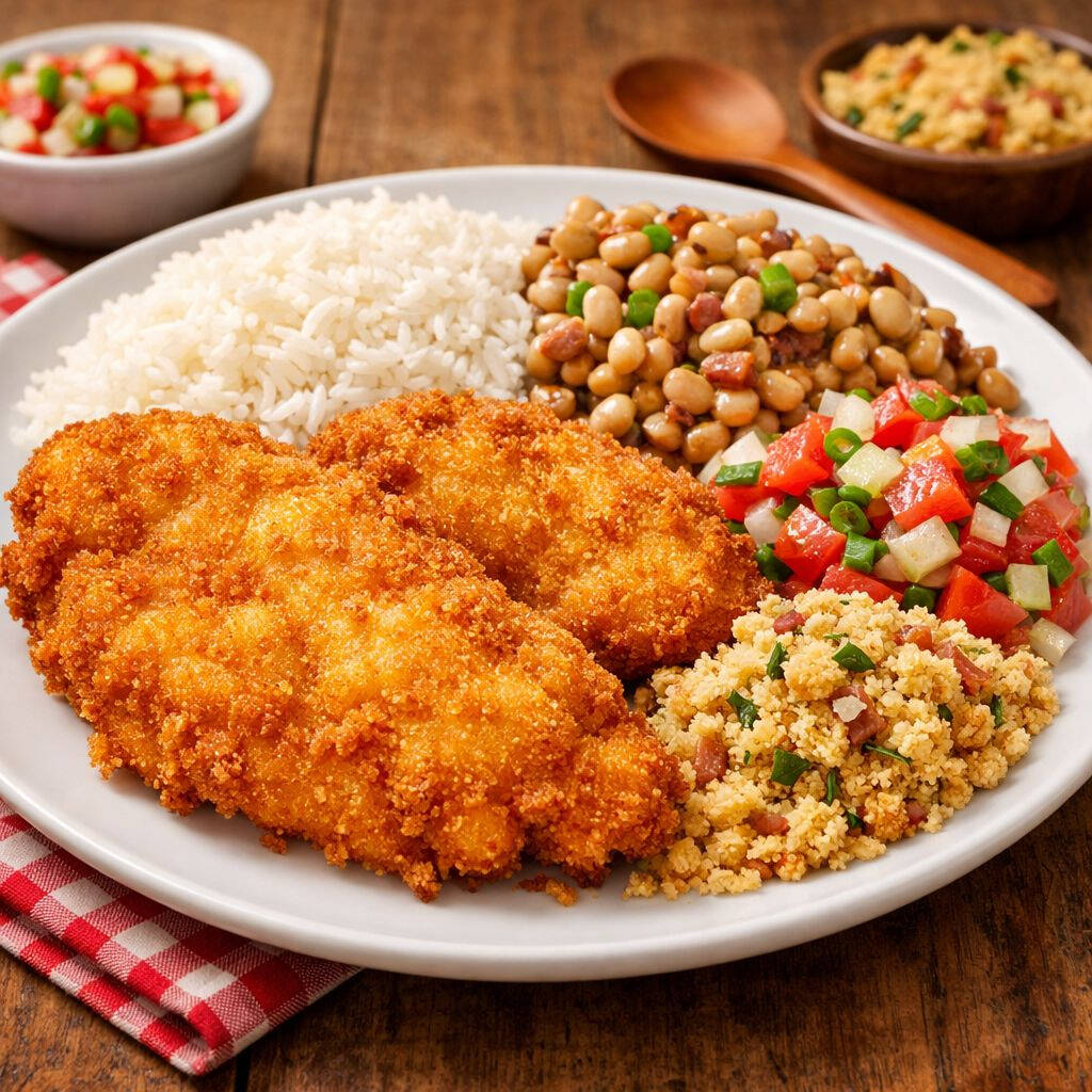 Crocante Frango À Milanesa, acompanhado de arroz soltinho, feijão-fradinho com tempero especial da casa. Finalizado com vinagrete artesanal e farofa crocante. Aprox. 500g