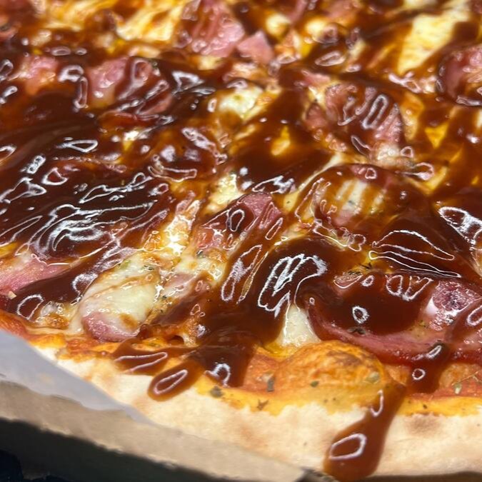 Nossa maravilhosa pizza com massa aberta a mão, Molho de tomate produzido na casa, queijo mussarela derretido, calabresa defumada, coberta com molho barbecue, cebola fresca e orégano.