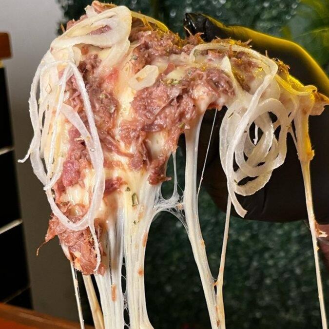 Molho de tomate produzido na casa, queijo Mussarela, cupim desfiado, cebola fresca e orégano..