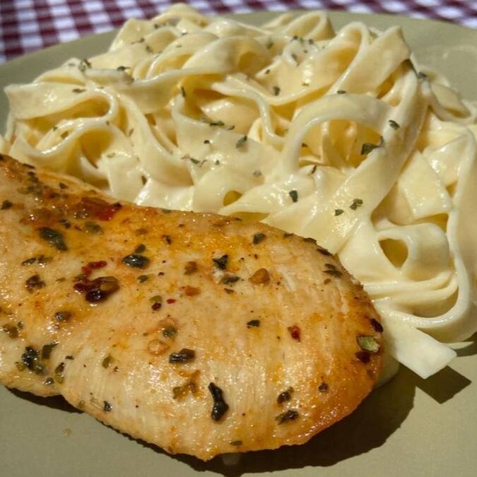 Fettuccine artesanal com filé de frango (aprox. 90g) e nosso molho branco.