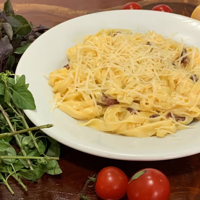 Nossa massa fresca com um molho cremoso de ovos, queijo parmesão, bacon crocante e pimenta preta. Uma escolha clássica para momentos especiais. Acompanha um refrigerante lata de 220ml.