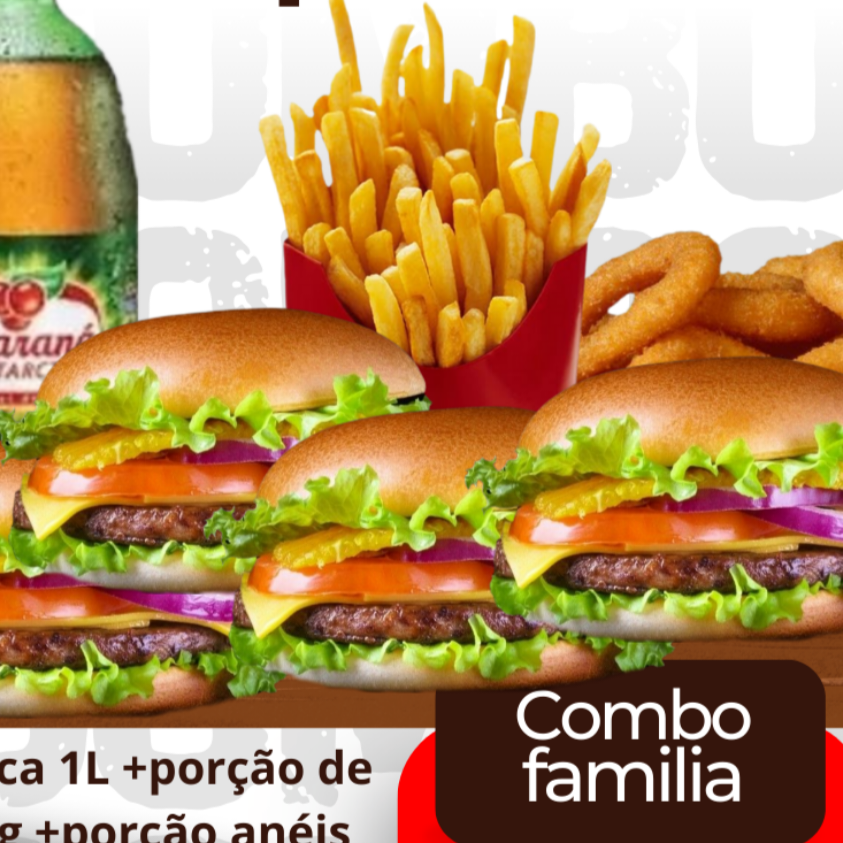 4 x-burguer, 1 porção de aneis de cebola, 1 porção de batata frita, 1 antartica de 1 litro