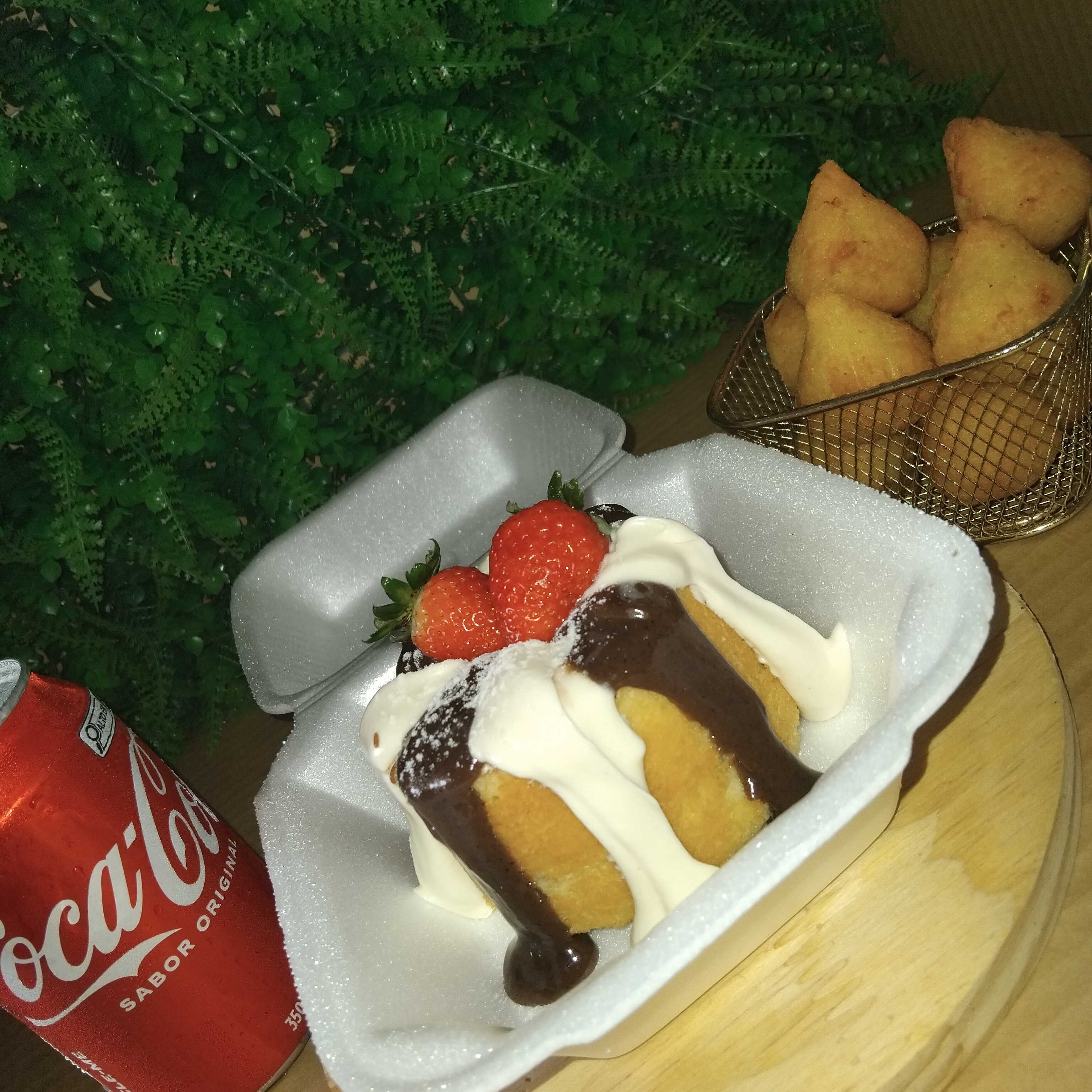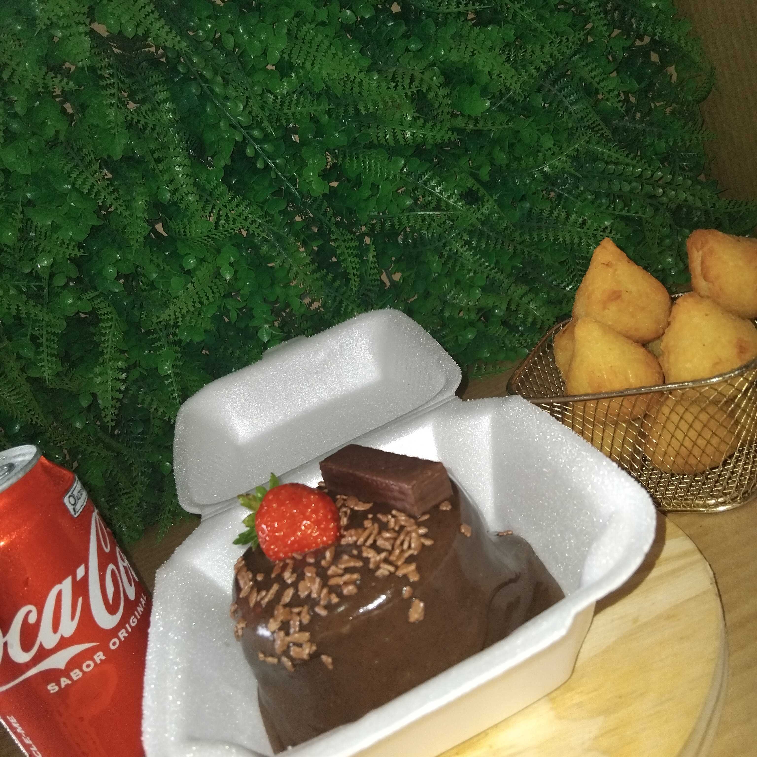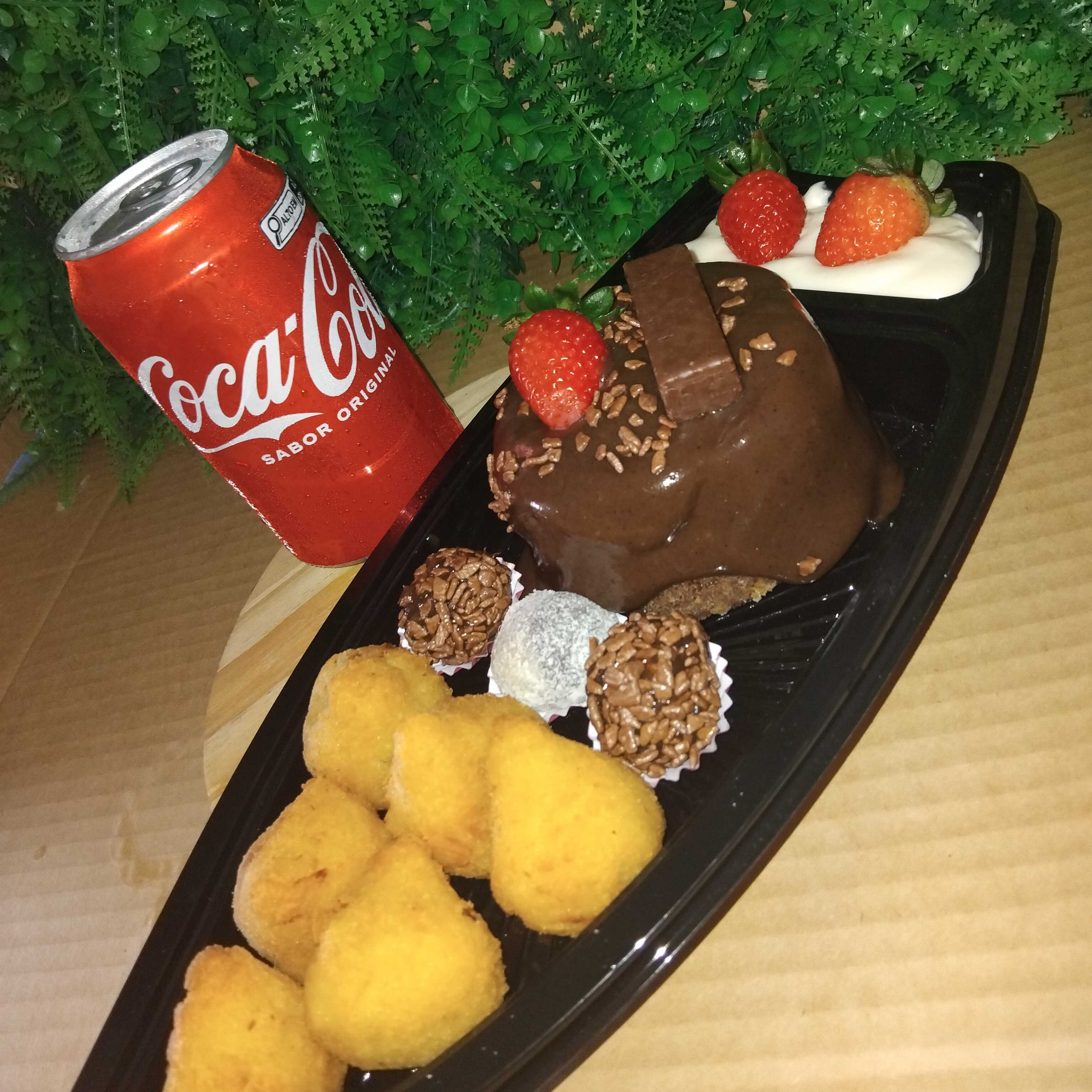 6 mini coxinhas, 3 docinhos, 1 bolo vulcão de chocolate, uma coca em lata, calda extra de ninho com morangos