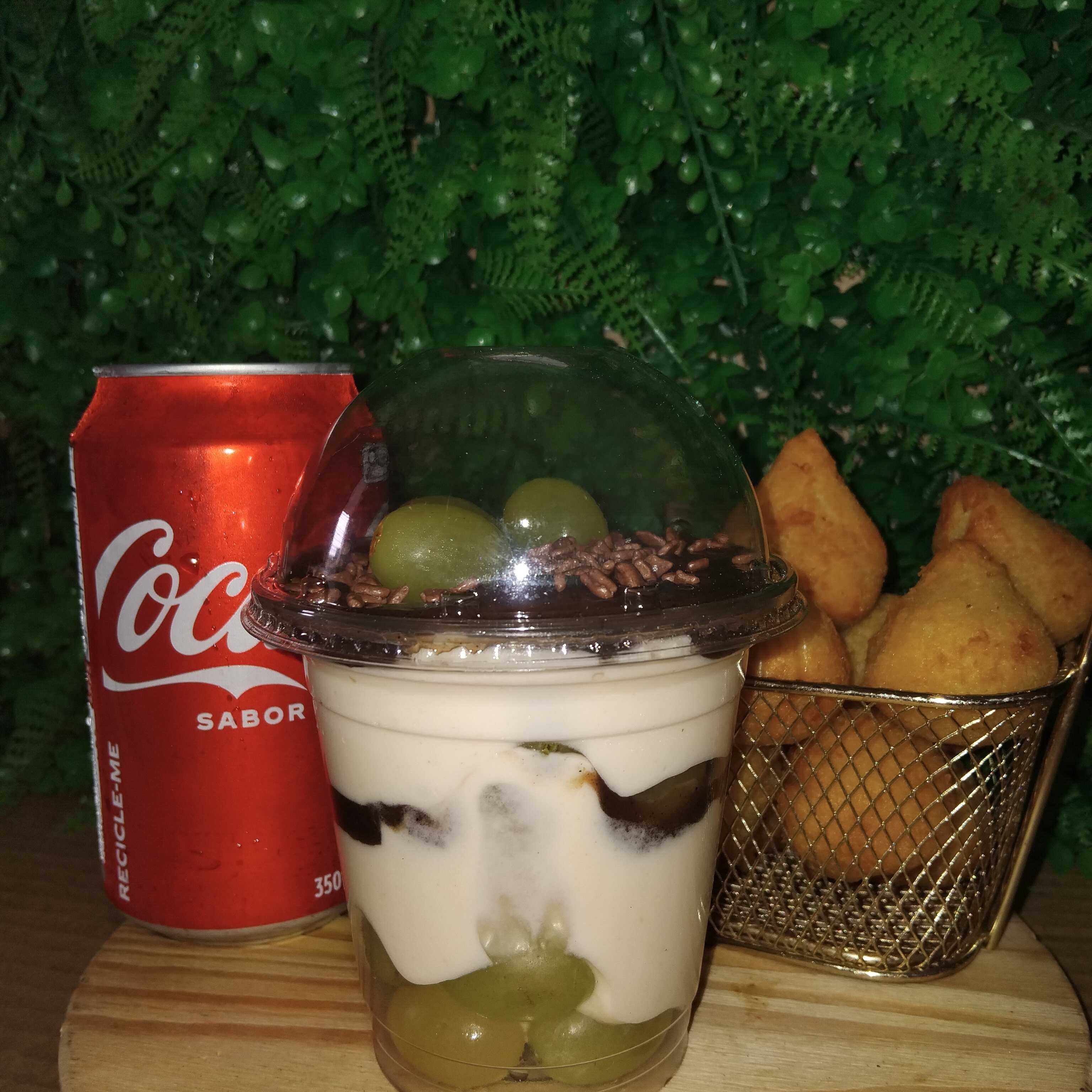1 coca lata, 1 bombom de uva, 1 porção de mini coxinha