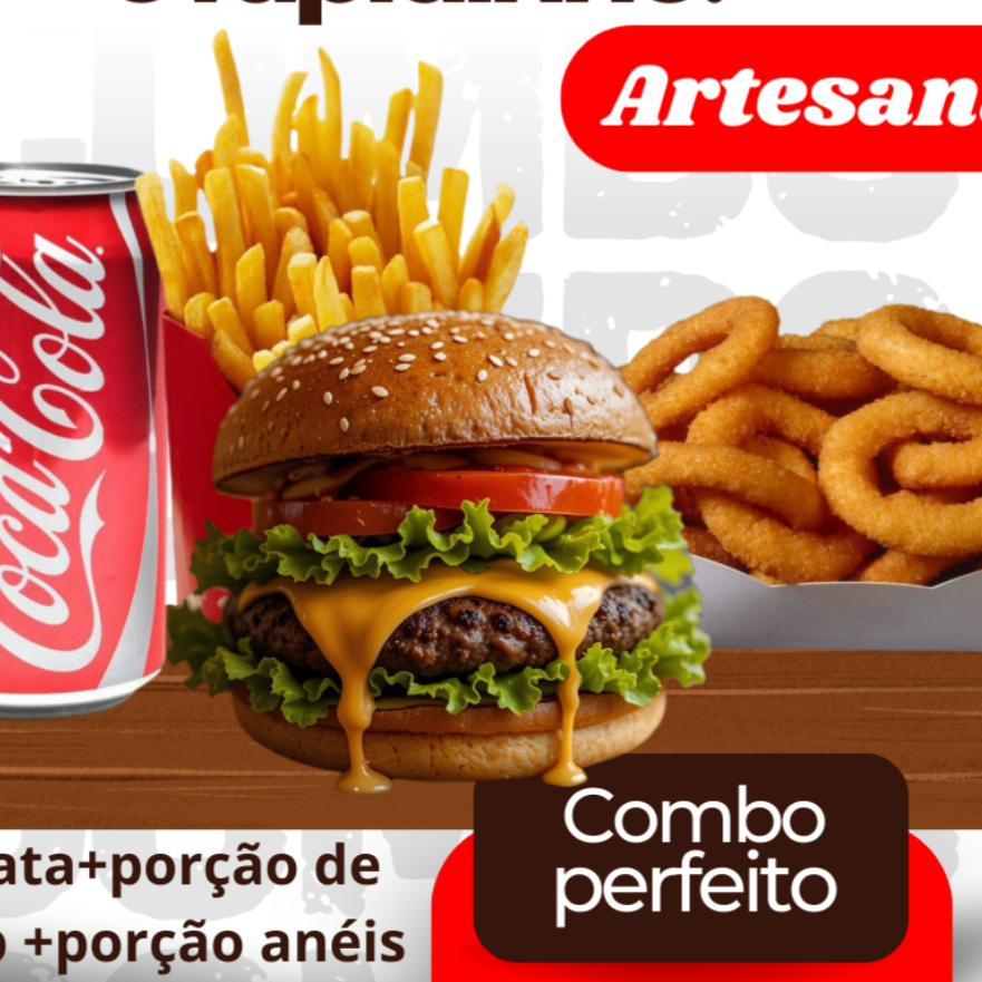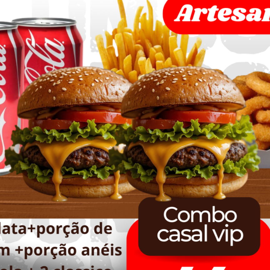 1 classico artesanal, 1 porção de aneis de cebola, 1 porção de batata frita, 1 coca em lata