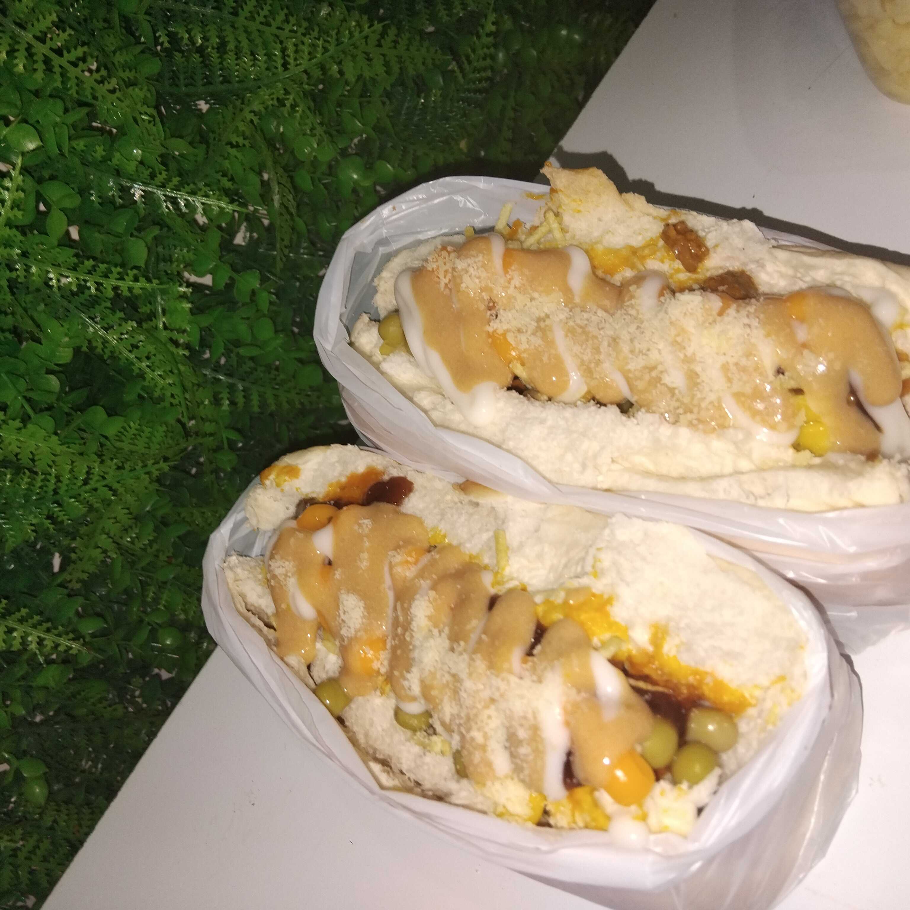 Salcisha, milho e ervilha, molho rose, mostarda, sheddar, tomate, cebola, batata palha,catchup, maionese, queijo ralado