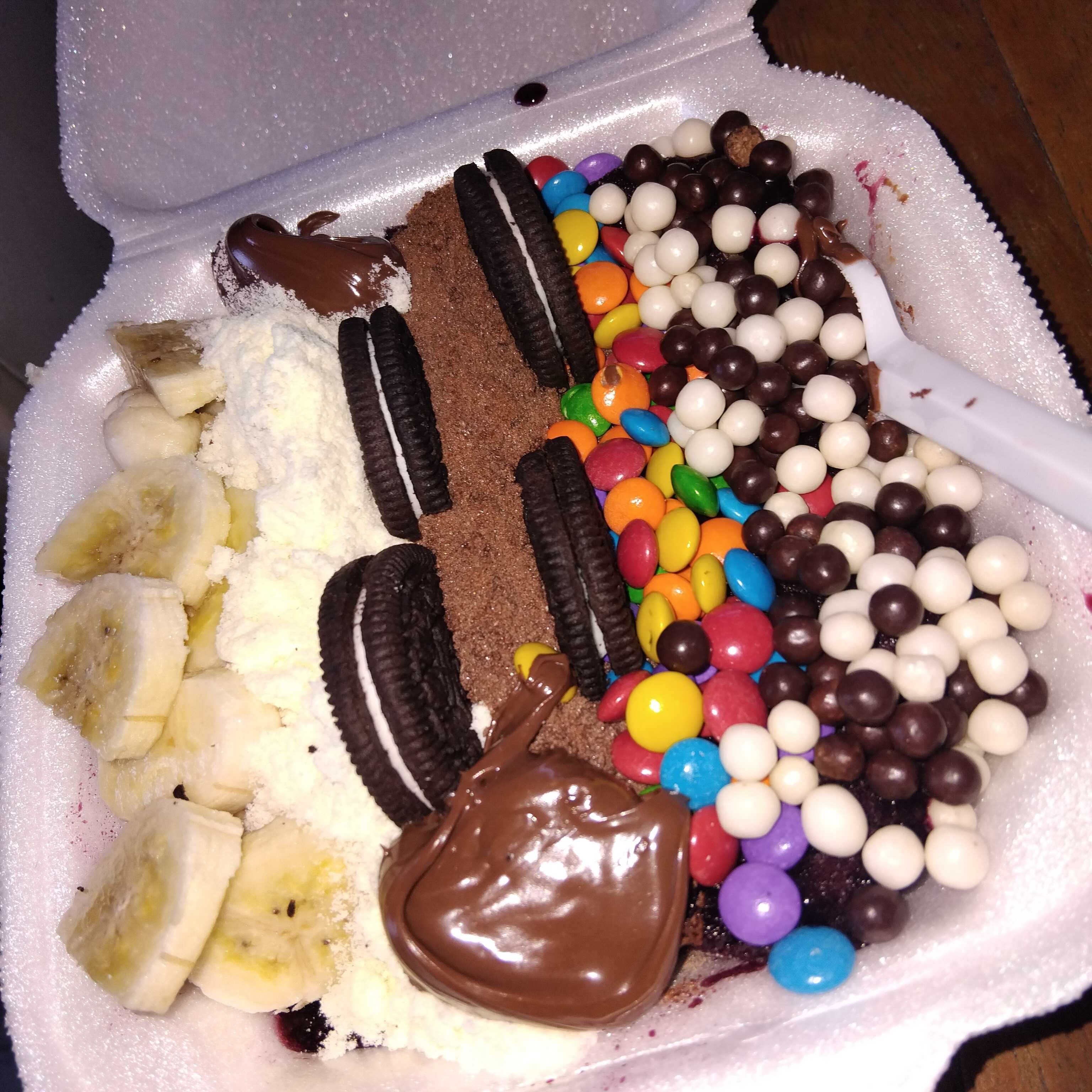 2 açai de 500 ml com 6 adicionais cada 1 fruta 1 calda