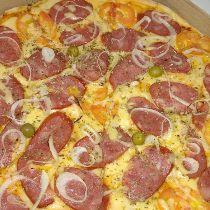 Mussarela, calabresa, tomate, cebola, azeitona e orégano