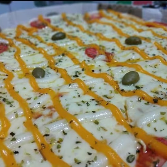 Mussarela, cheddar, Catupiry, tomate, azeitona e orégano