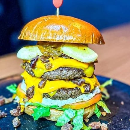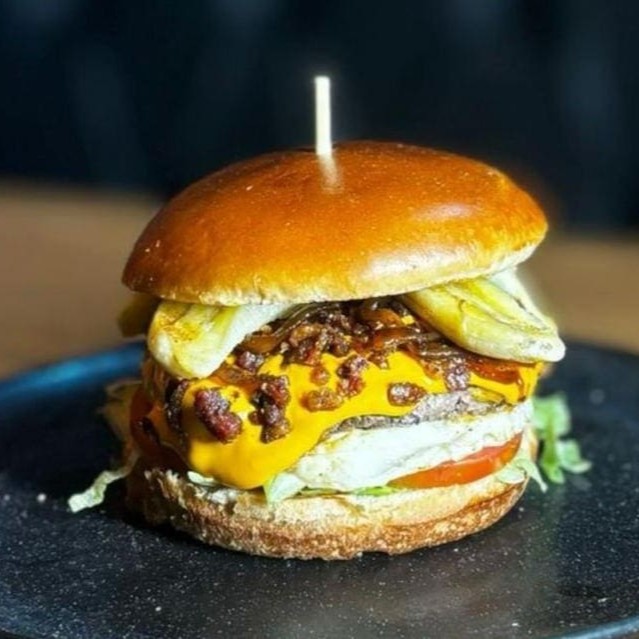 Pão brioche, blend 90g, queijos cheddar em fatia, bacon, ovo frito, banana frita, tomate,cheddar cremoso,alface.