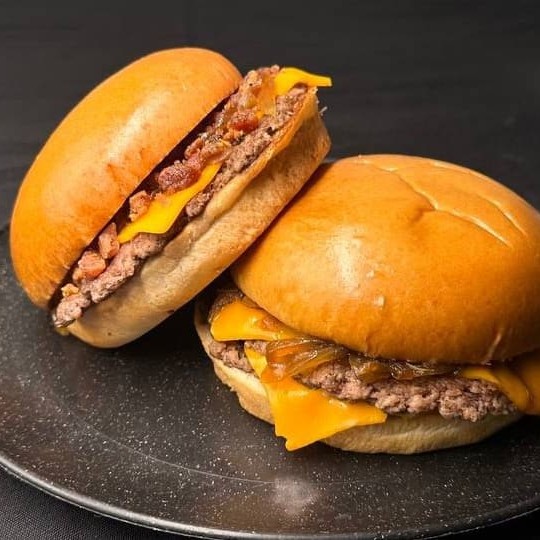 1 Smash Cheddar Burger c/ Pão brioche, blend artesanal 90g, cheddar fatiado, tomate,cebola caramelizada, cheddar cremoso. 1 Smash Cheddar Bacon Burger c/ Pão brioche, 2 blends 90g, cheddar em fatia,cheddar cremoso e bacon, cebola caramelizada.