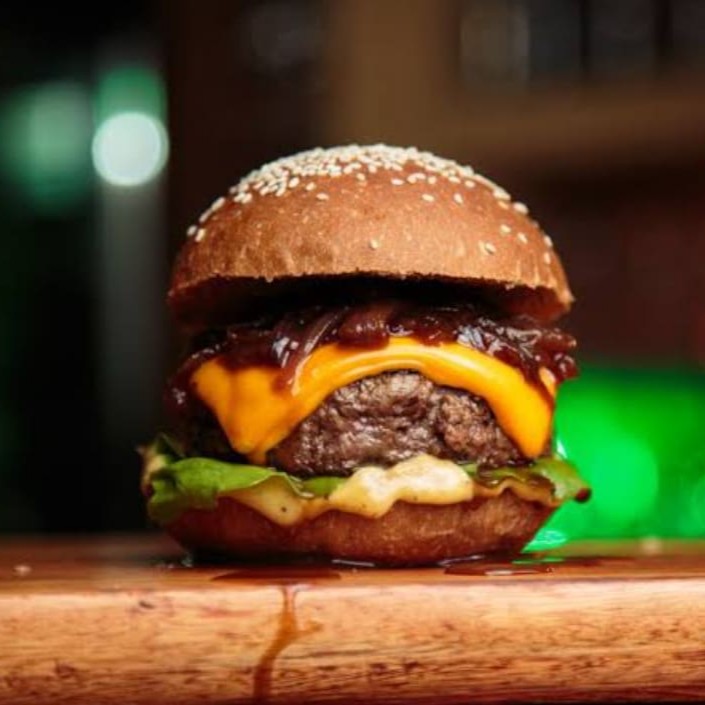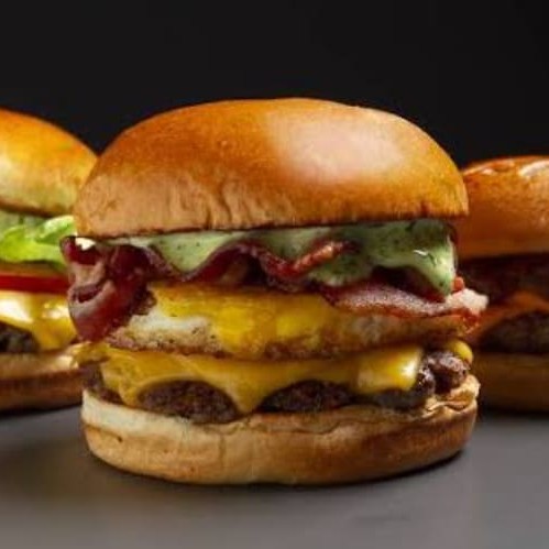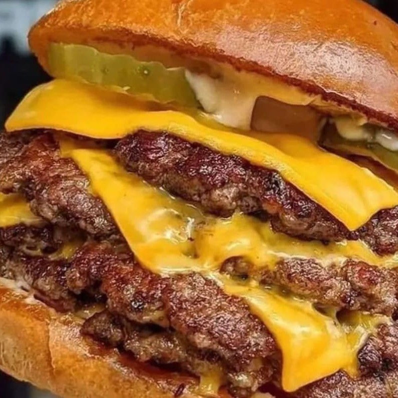 Hambúrguer tripla carne, tripla camada de queijo cheddar, tripla camada de bacon.