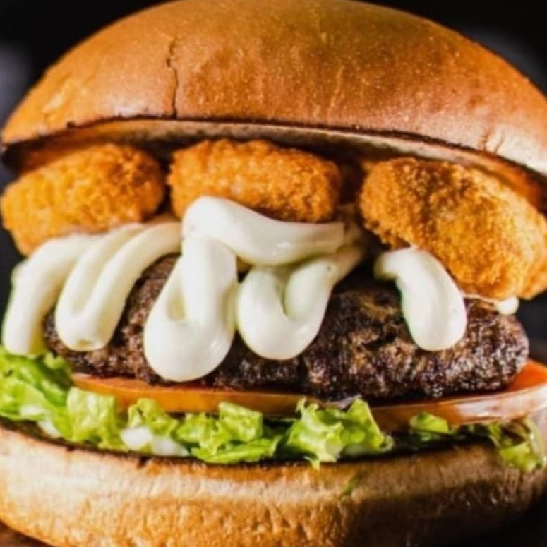 Pão bola , 1x carne de hambúrguer artesanal (100g) 1x porção de frango empanado, batata palha , alface, tomate, cebola caramelizada ao molho shoyu e por fim uma deliciosa maionese cremosa feita de maneira totalmente artesanal.