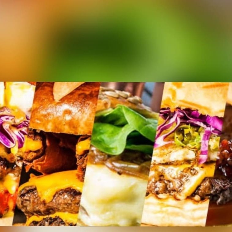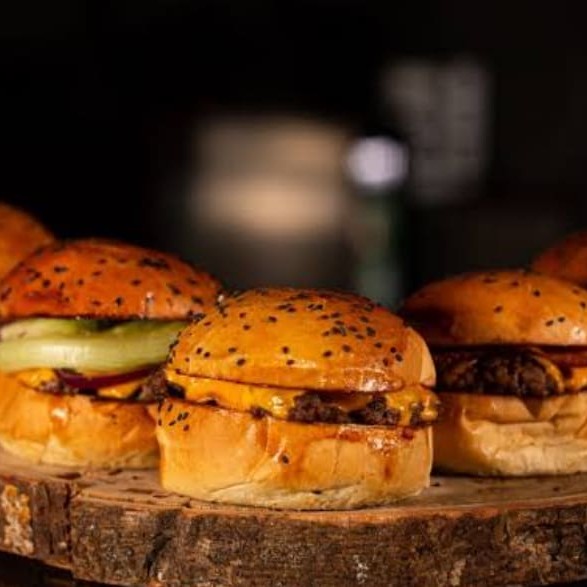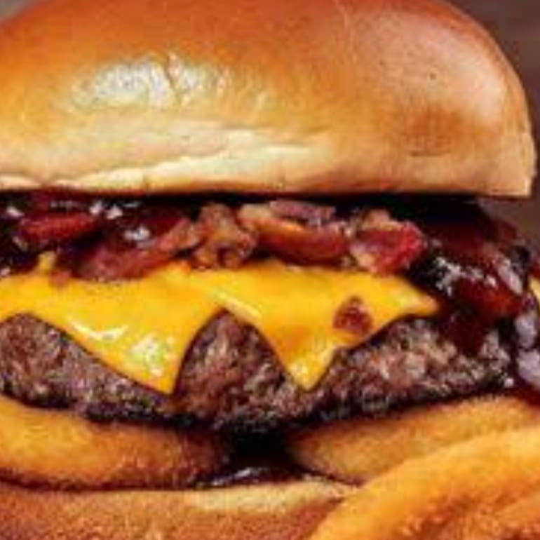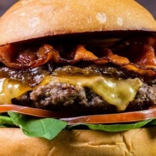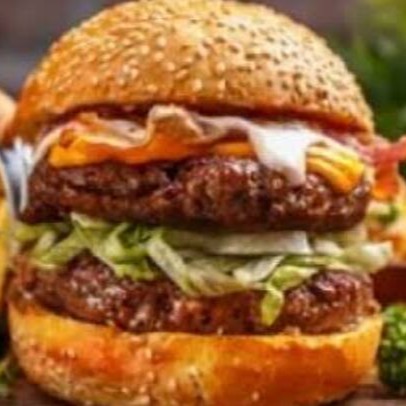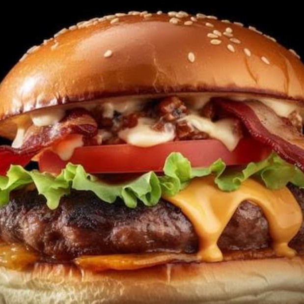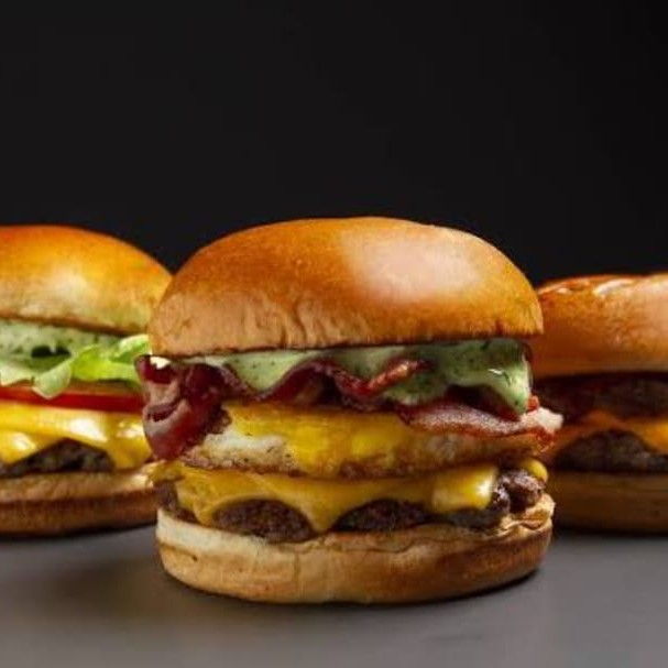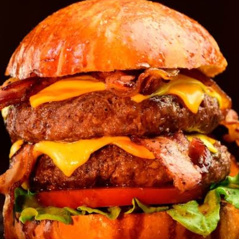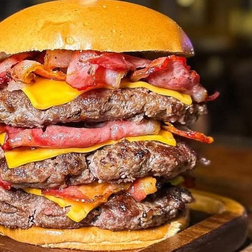 Hambúrguer de 3 carnes, tripla camada de queijo cheddar, tripla camada de bacon.