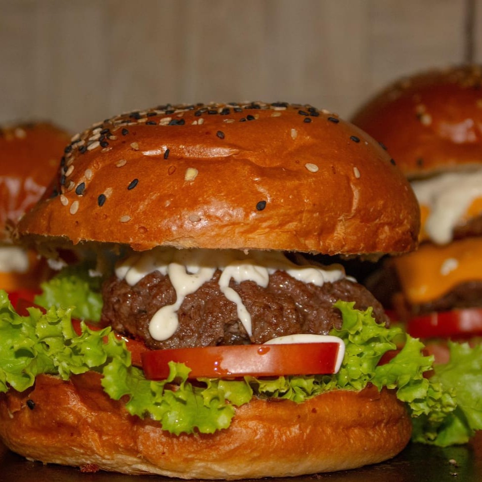 Pão brioche amanteigado, 1x camada de queijo cheddar, 1 camada de picanha, 1 blend de carne e maionese cremosa.