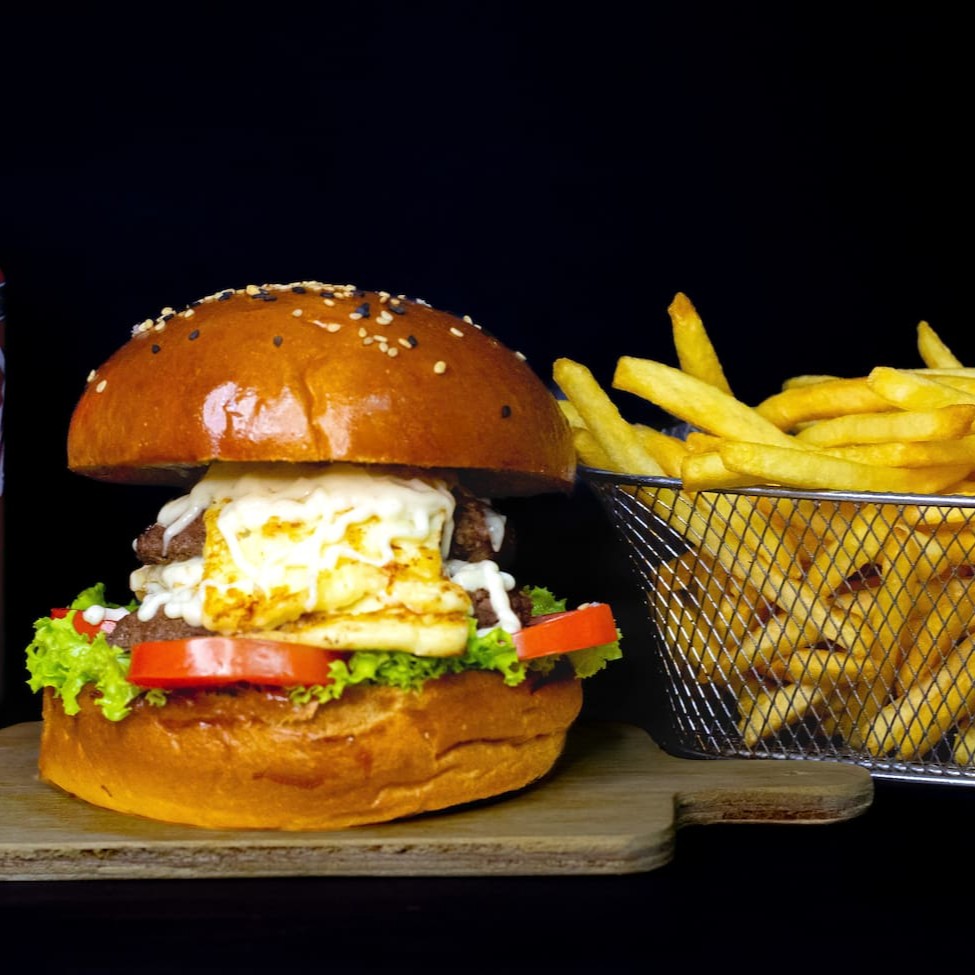 Pão bola, 1x carne de Hambúrguer artesanal (100)g 1x porção de queijo coalho, 1 camada de maiosene cremosa feita de maneira totalmente artesanal, alface, tomate, cebola caramelizada ao molho shoyu e batata palha.