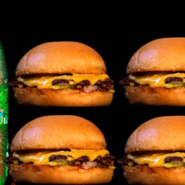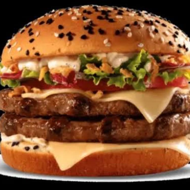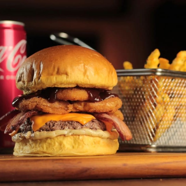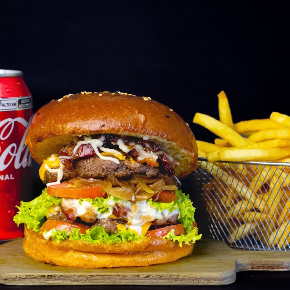 Uma experiência de carnes duplas 2x, 2x bacon 2x queijo cheddar+ batata frita fina+Coca cola super gelada.