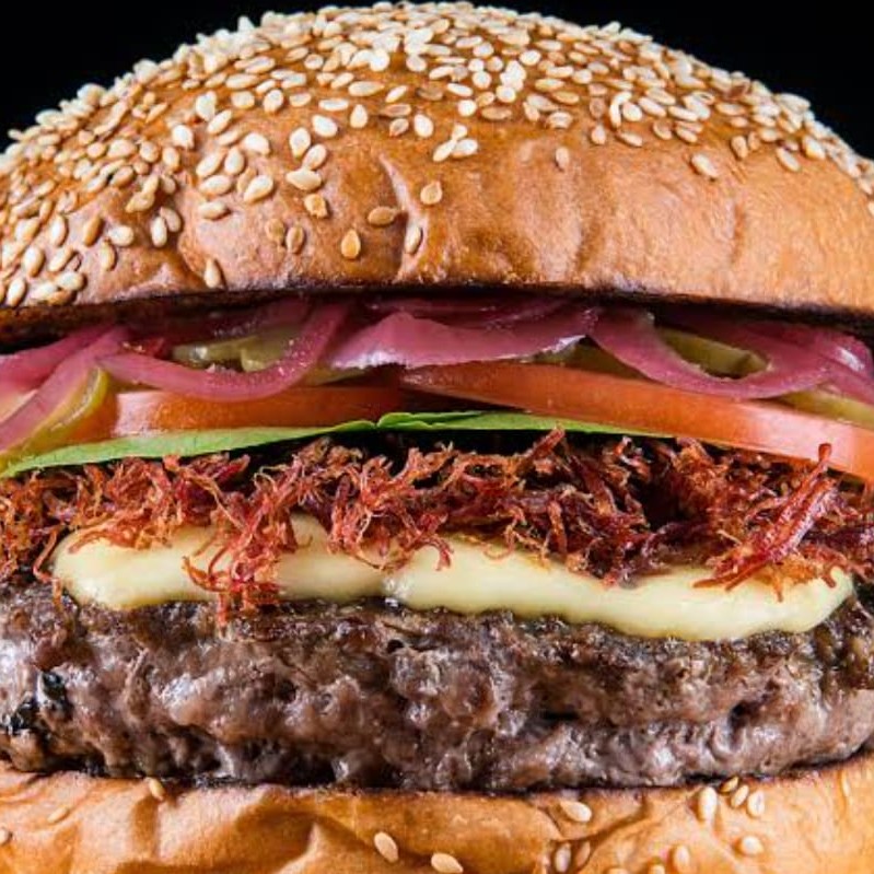 Pão bola, Hambúrguer artesanal de carne (100g) queijo coalho, charque frita na chapa, alface, tomate, cebola caramelizada ao molho shoyu e uma camada de maiosene cremosa feita de maneira totalmente artesanal.