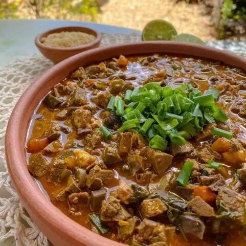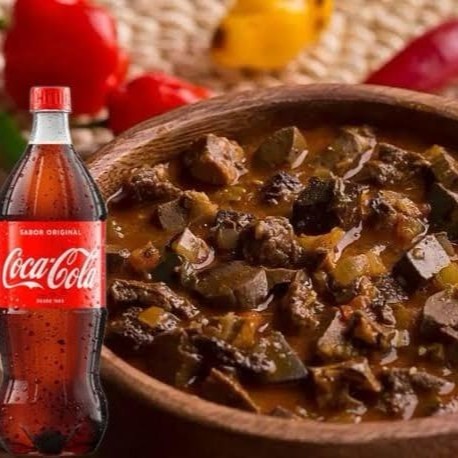 Delicioso Sarapatel de porco (300g) servido com arroz branco (200g), vinagrete especial e farofa crocante temperada. Peso total do prato, aproximadamente 550g Acompanha Coca-Cola 500ml.