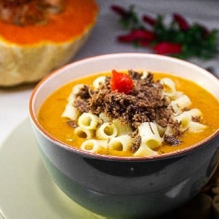 Ingredientes: Abóbora moranga, batatas inglesas e carne de sol desfiada e assada no forno. Acompanhamentos Free: Torradinhas,. Carboidrato(opciona). Obs: Contém pimenta do reino.