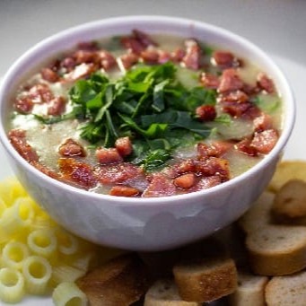 Ingredientes: Vegetais; Couve folha, macaxeira. Proteínas; Calabresa salteada. Contém; pimenta do reino. Acompanhamentos Free; torradinhas. Carboidrato (opcional).