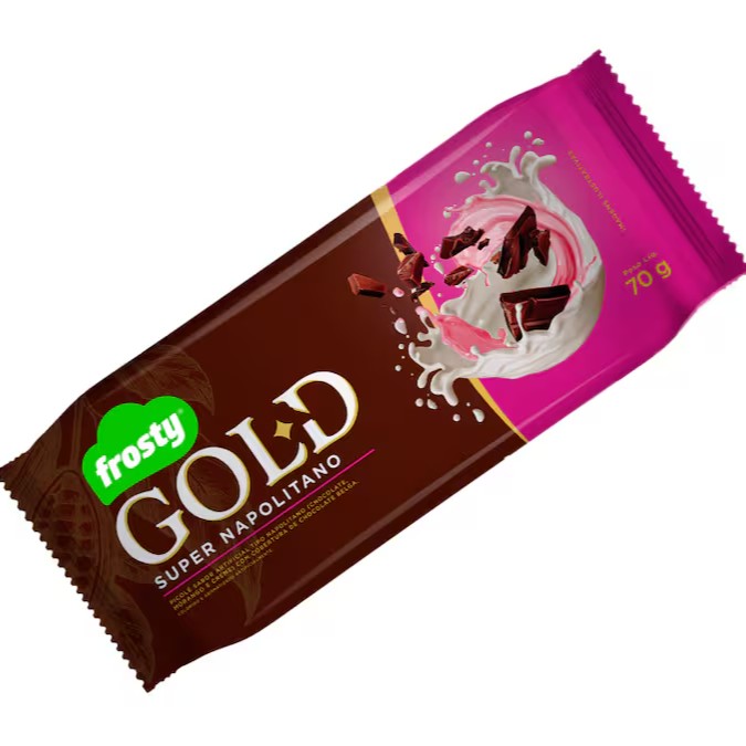 Descubra o delicioso Gold Super Napolitano Frosty, um picolé que vai te levar às alturas com o encantador sabor tríplice de Napolitano! Essa combinação de chocolate, morango e baunilha cria um paladar verdadeiramente irresistível que vai conquistar o seu coração. E como se isso não bastasse, este picolé é ainda mais especial por ser generosamente envolvido em uma cobertura de chocolate que derrete na boca.