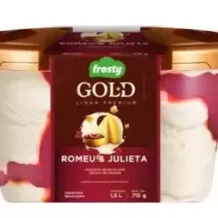 O clássico mais amado do Brasil agora ganhou uma versão ainda mais especial na linha Gold da Frosty. Nosso sorvete ultra cremoso combina o sabor inconfundível da goiabada com a suavidade do queijo, criando uma explosão de sabor a cada colherada. Peça agora e descubra porque o Romeu e Julieta Gold vai conquistar o seu coração! Contém Glúten e Lactose. Alerta para Alérgicos: Contém leite, creme de goiaba, queijo e açúcar.